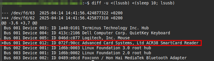 diff -u <(lsusb) <(sleep 10; lsusb)